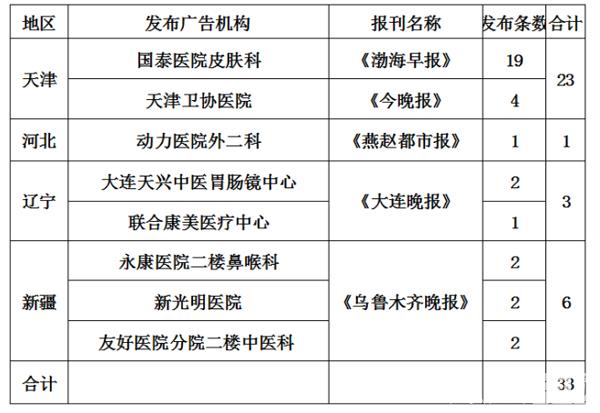 其中天津發(fā)布虛假違法中醫(yī)醫(yī)療廣告情況較為嚴(yán)重,國泰醫(yī)院皮膚科在《渤海早報》發(fā)布19條次,天津衛(wèi)協(xié)醫(yī)院在《今晚報》發(fā)布4條次。河北省的動力醫(yī)院外二科在《燕趙都市報》發(fā)布1條次。遼寧省的大連天興中醫(yī)胃腸鏡中心和聯(lián)合康美醫(yī)療中心在《大連晚報》分別發(fā)布2條次、1條次。新疆維吾爾自治區(qū)的永康醫(yī)院二樓鼻喉科、新光明醫(yī)院、友好醫(yī)院分院二樓中醫(yī)科在《烏魯木齊晚報》各發(fā)布2條次。具體名單見下: